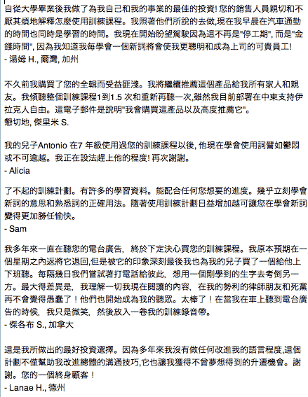 研究證明了一個應用自如的 英語能力是跟職業生涯升遷 ,個人收入,以及社交方面 有直接的關係。想要在您的 職業生涯更上一層樓,您必 須具備著至少與您相同職業 的成員一般辭彙水準。